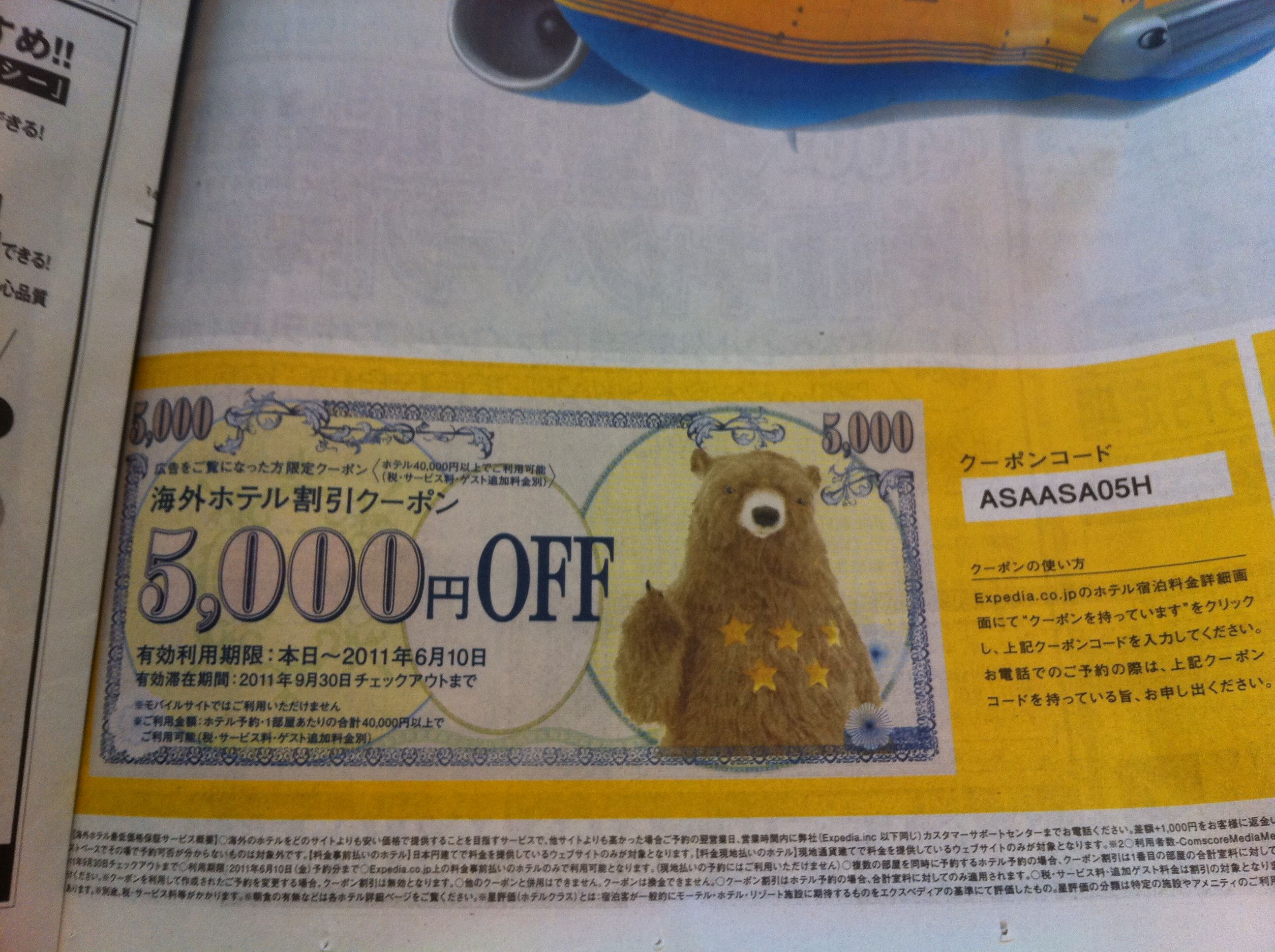 エクスポディアで予約できる30,000円以上のホテル予約で利用出来る3000円引きクーポンです。30,000円のホテルなら最大10%OFFになるということですね♪